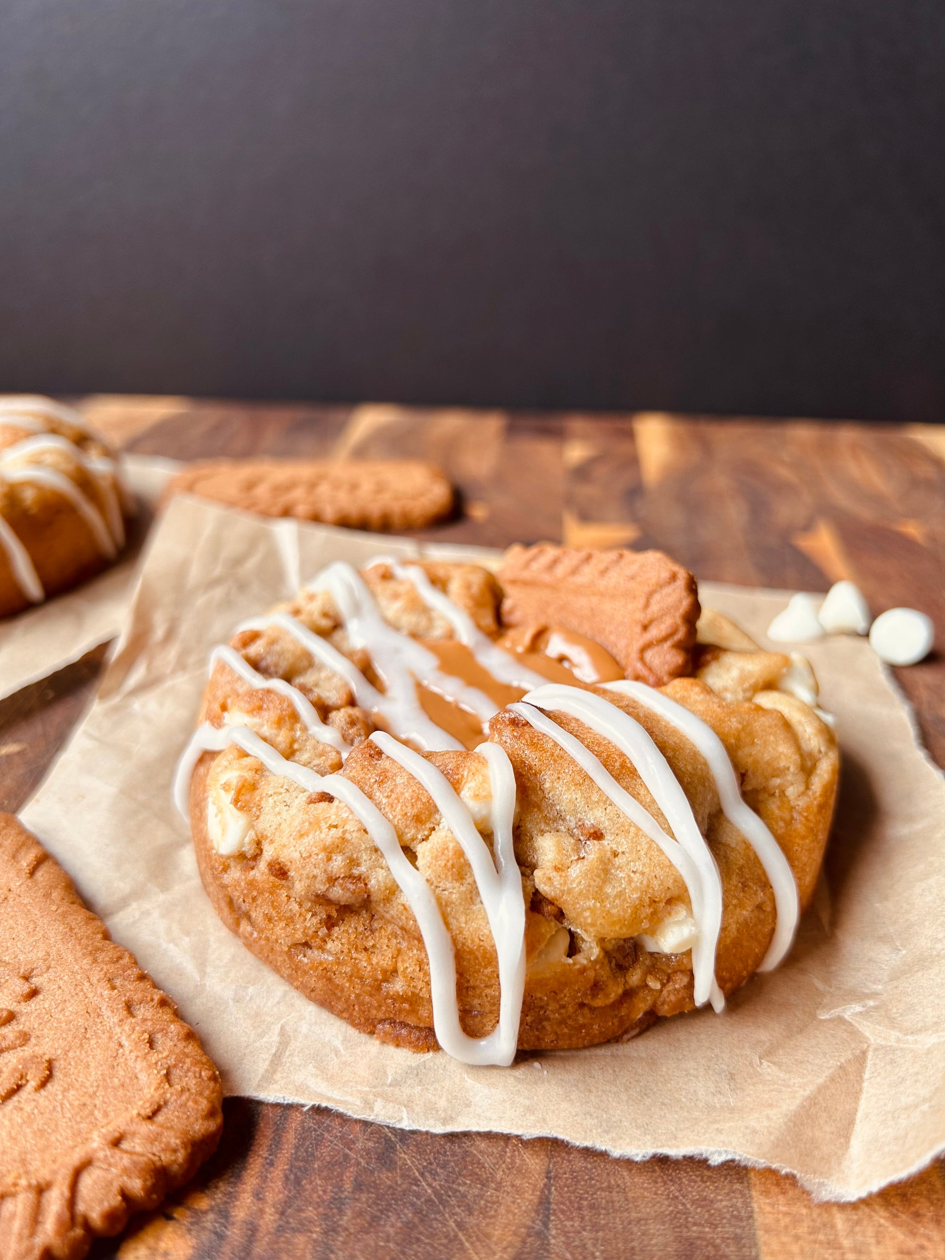 A cookie butter infused cookie combined with white chocolate chips and biscoff cookies. This cookie centers a puddle of gooey cookie butter goodness.