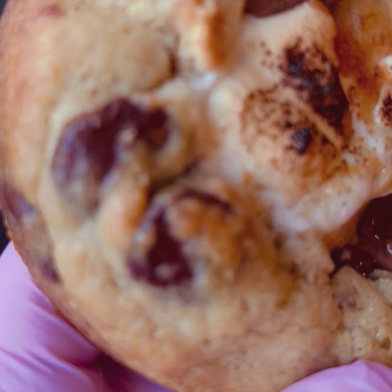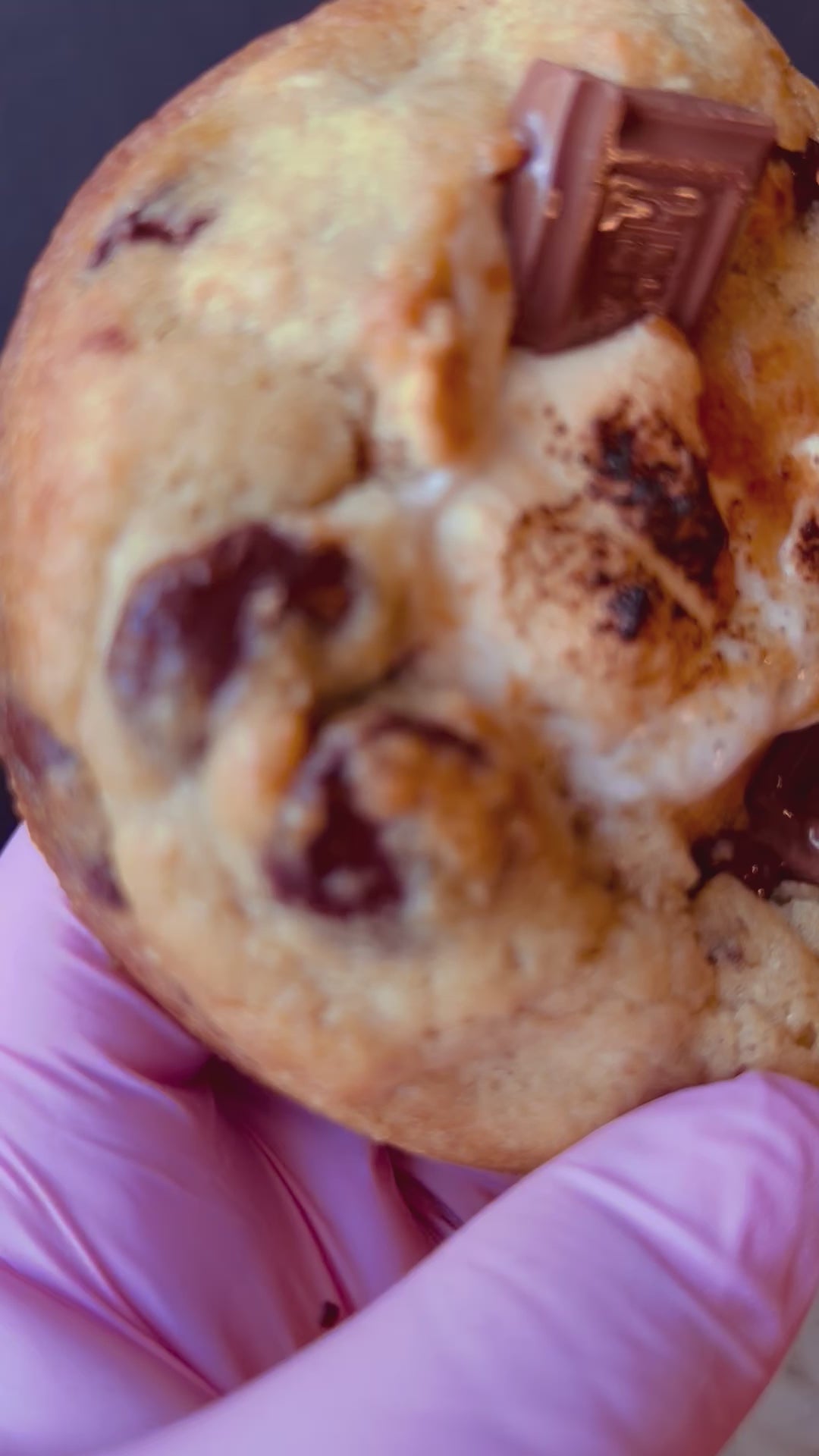 A campfire dream flavored cookie combined with chocolate chips and graham crackers. Each cookie wears a puddle of toasty marshmallow goodness as a crown.